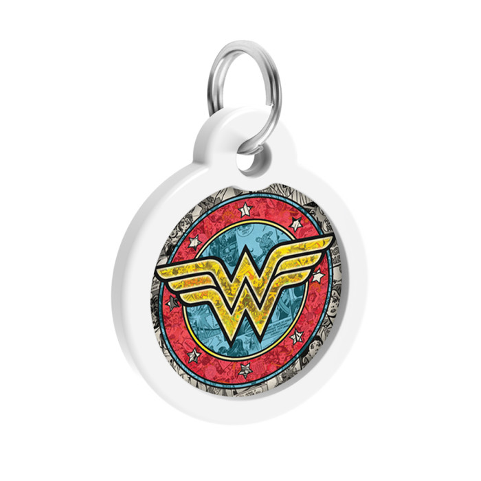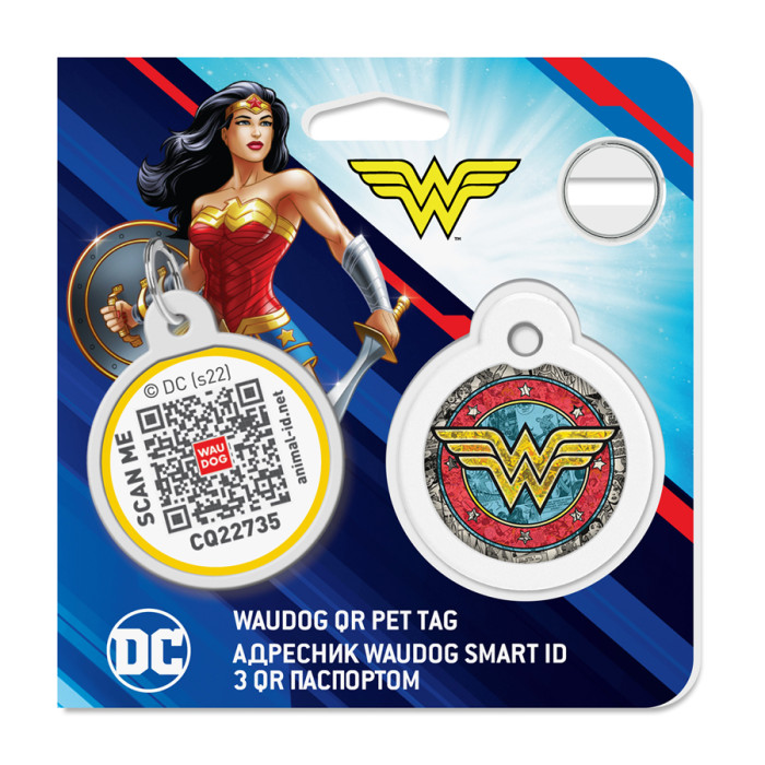Адресник для собак і котів металевий WAUDOG Smart ID з QR паспортом, малюнок "Чудо-жінка 2", коло, Д 30 мм