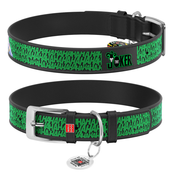 Нашийник для собак шкіряний WAUDOG Design з QR паспортом, малюнок "Джокер", XL, Ш 35 мм, Дов 46-59 см, чорний