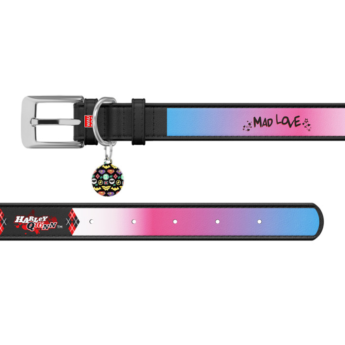 Нашийник для собак шкіряний WAUDOG Design з QR паспортом, малюнок "Харлі Квін", Ш 12 мм, Дов 20-28 см чорний