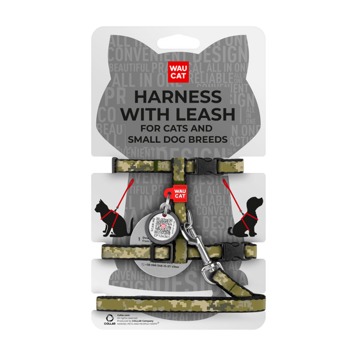 Шлея з повідцем WAUDOG Nylon з QR-паспортом, малюнок "Мілітарі", пластиковий фастекс, XS, Ш 10 мм, Дов 122 см, В 25-40 см, С 20-30 см