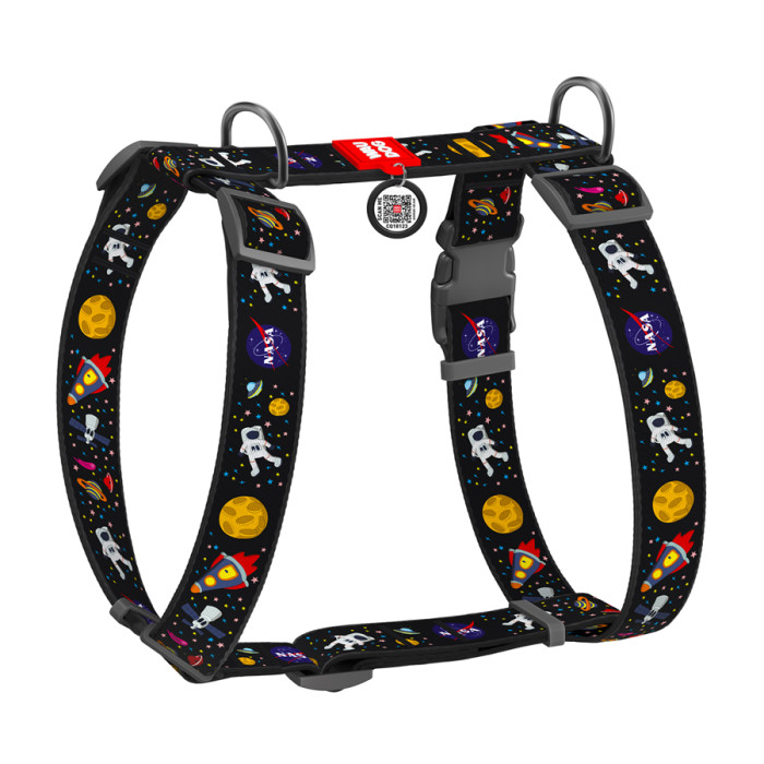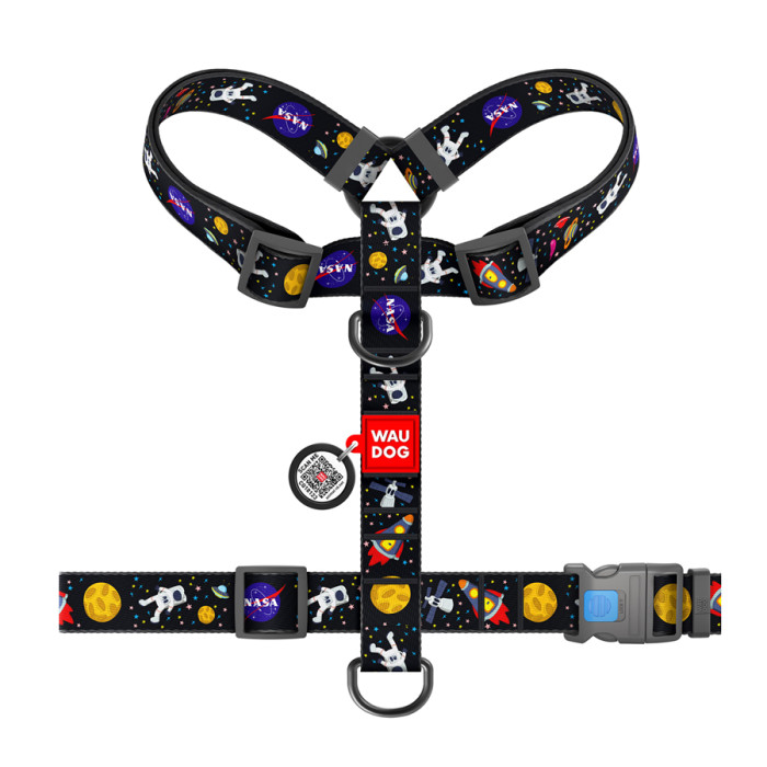Шлея для собак анатомічна H-подібна WAUDOG Nylon з QR-паспортом, малюнок "NASA", пластиковий фастекс, XL, Ш 35 мм, А 55-95 см, В 70-110 см