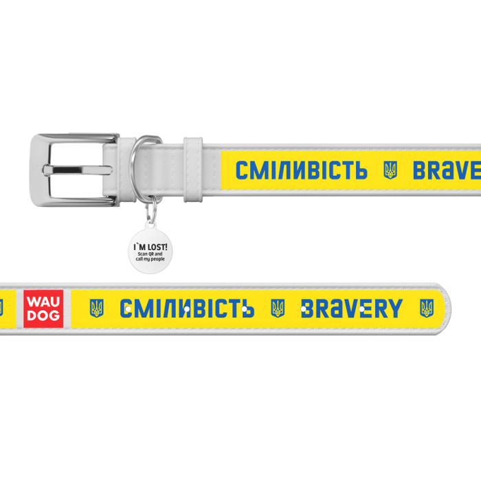 Нашийник для собак шкіряний WAUDOG Design з QR паспортом, малюнок "Сміливість", L, Ш 25 мм, Дов 38-49 см білий