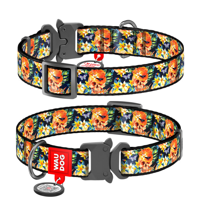 Нашийник для собак нейлоновий WAUDOG Nylon з QR паспортом, малюнок "Гламурні черепа", металева пряжка-фастекс, Ш 25 мм, Дов 33-49 см