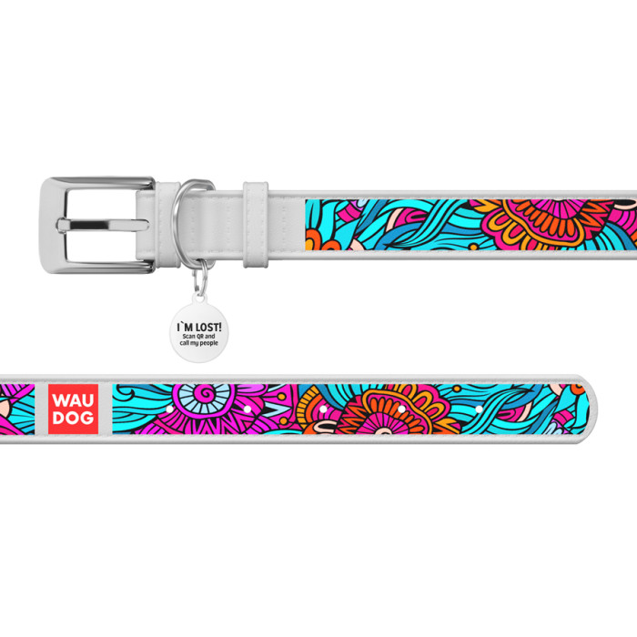 Нашийник для собак шкіряний WAUDOG Design з QR паспортом, малюнок "Літо", M, Ш 20 мм, Дов 29-38 см, білий