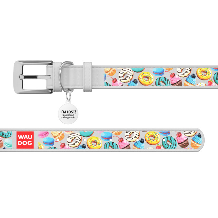 Нашийник для собак шкіряний WAUDOG Design з QR паспортом, малюнок "Пончики", M, Ш 20 мм, Дов 29-38 см, білий