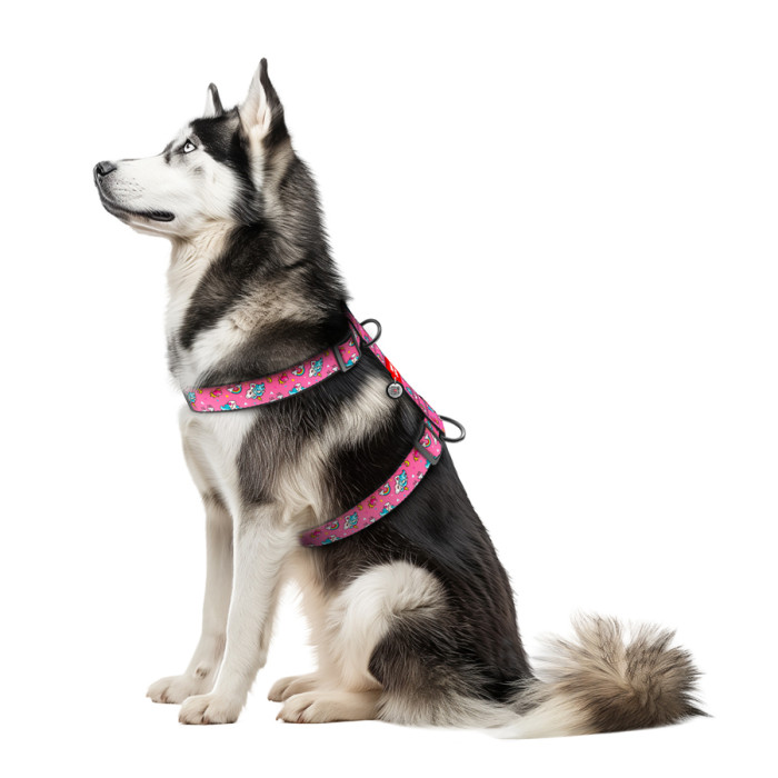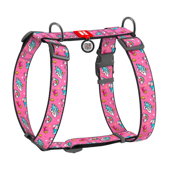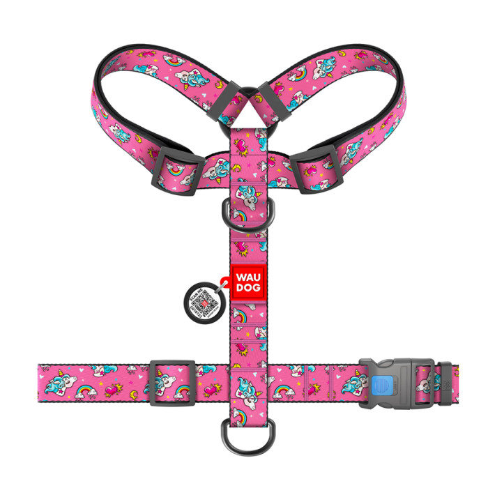 Шлея для собак анатомічна H-подібна WAUDOG Nylon з QR-паспортом, малюнок "Єдинороги", пластиковий фастекс, XL, Ш 35 мм, А 55-95 см, В 70-110 см