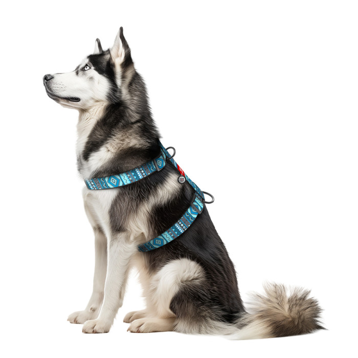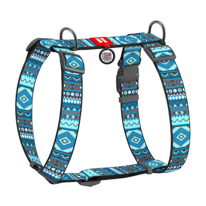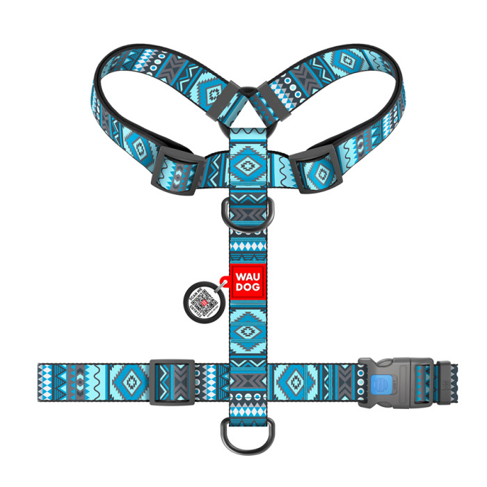 Шлея для собак анатомічна H-подібна WAUDOG Nylon з QR-паспортом, малюнок "Етно синій", пластиковий фастекс, XL, Ш 35 мм, А 55-95 см, В 70-110 см