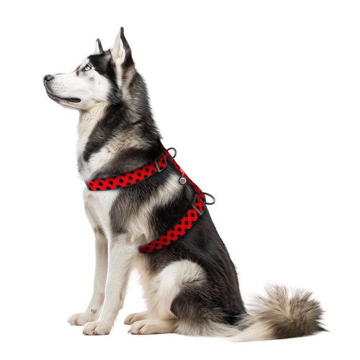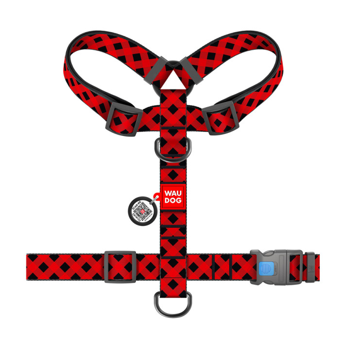 Шлея для собак анатомічна H-подібна WAUDOG Nylon з QR-паспортом, малюнок "Шотландка червона", пластиковий фастекс, XL, Ш 35 мм, А 55-95 см, В 70-110 см