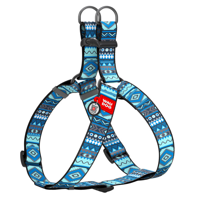 Шлея для собак WAUDOG Nylon з QR паспортом, малюнок "Етно синій", пластиковий фастекс, XL, Ш 35 мм, А=В 70-100 см