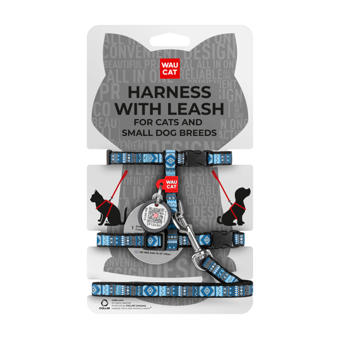 Шлея з повідцем WAUDOG Nylon з QR паспортом, малюнок "Етно синій", пластиковий фастекс, Ш 10 мм, В 25-40 см, С 20-30 см